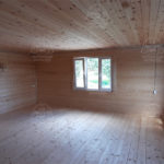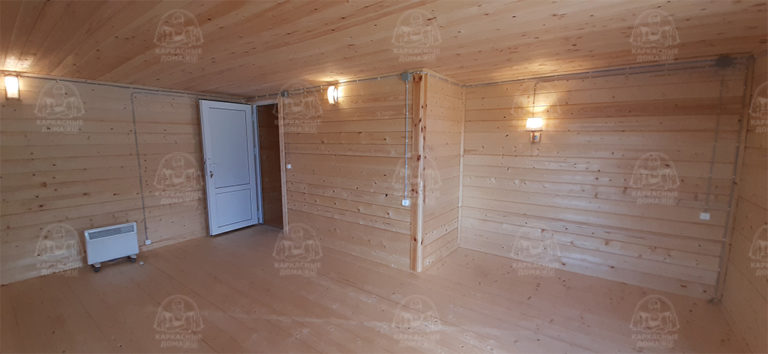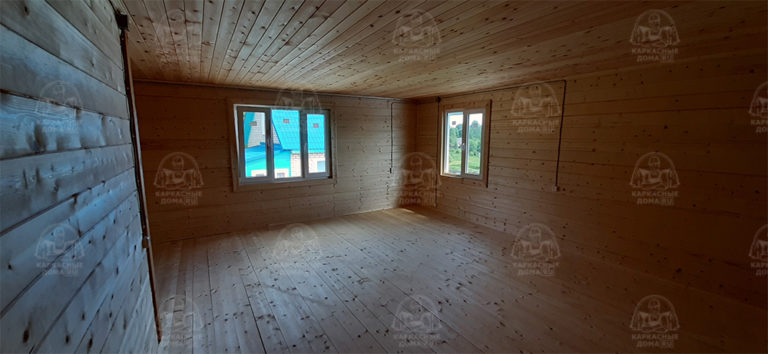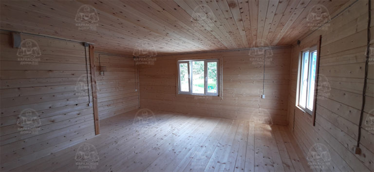 Внутренняя отделка. Стены и перегородки - имитация бруса, толщиной 16 мм, шириной 140 мм, камерной сушки. Потолок - Евровагонка хвойных пород, класс «А, В», камерной сушки. Пол - влагостойкие плиты «Квик Дек», в ванной - ЦСП.