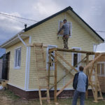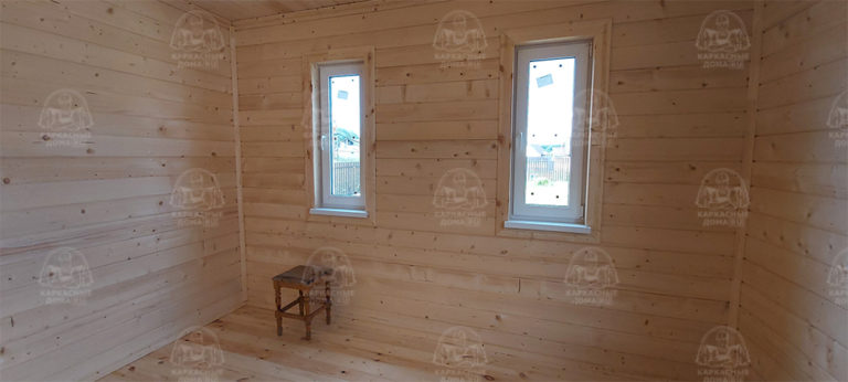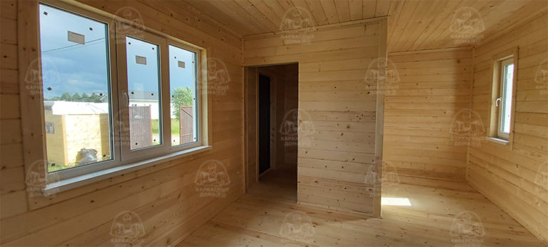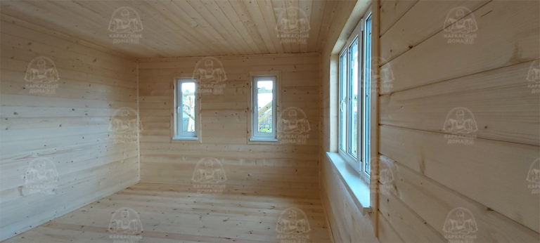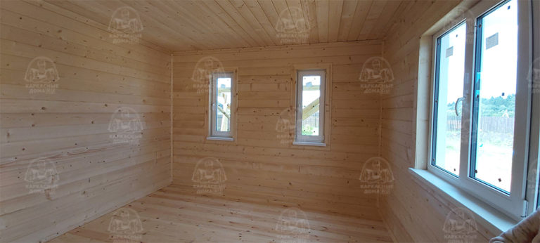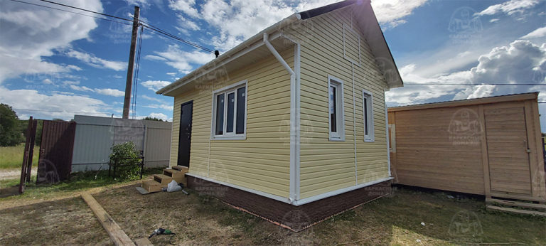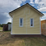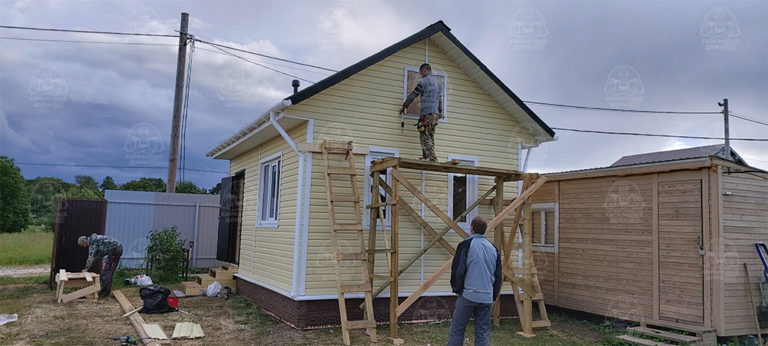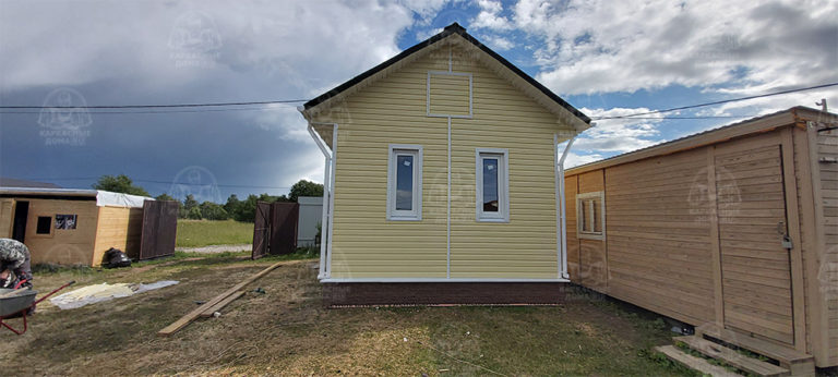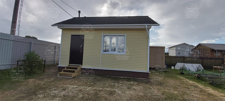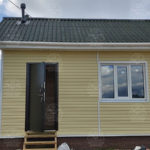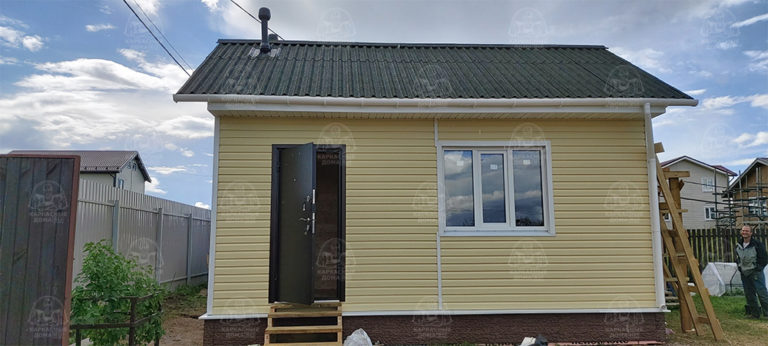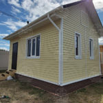 Наружная отделка- плиты OSB, толщиной 9 мм. Затем, через контробрешетку дом обшит виниловым сайдингом «Дёке». Серия «Стандарт» D4D, корабельный брус, цвет лимон.
