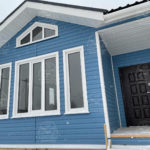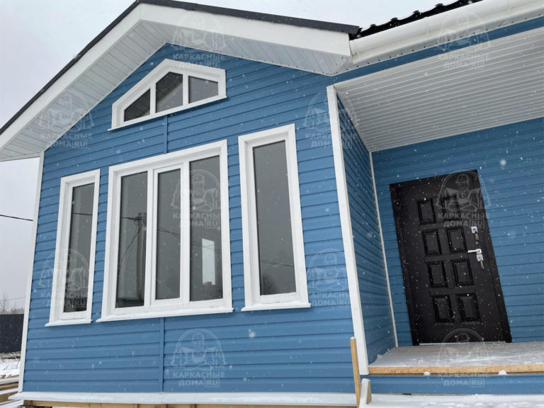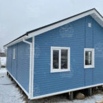 Наружная отделка внешних стен. Через контр-обрешетку из бруска, монтируется сайдинг «Docke» Стандарт, Ёлочка D5C, цвет- Голубика. Внешние и внутренние углы дома, околооконные и дверные профили цвета-пломбир (белый). Устанавливаются металлические цокольные отливы белого цвета.