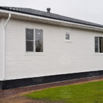 - Цоколь утеплен пенополистеролом «Пеноплекс», 50мм и зашит цокольными панелями ПВХфирмы «Дёке», серого цвета «под кирпич».
